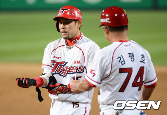 25일 오후 광주 무등야구장에서 열린 '2012 팔도 프로야구' KIA 타이거즈와 LG 트윈스의 경기, 5회말 2사 3루 KIA 이용규가 우전 1타점 적시타를 치고 팔꿈치 보호대를 풀고 있다.