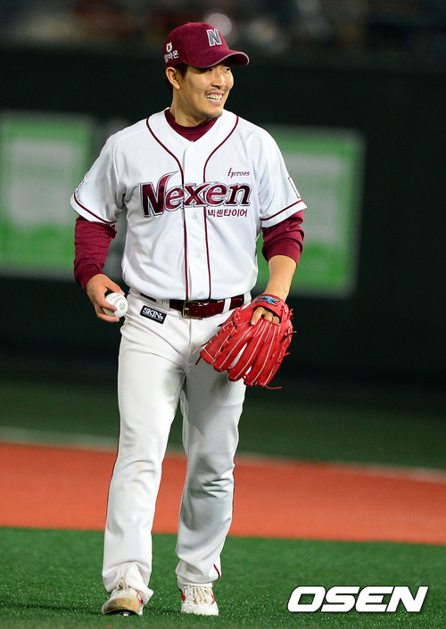 25일 오후 서울 목동구장에서 열린 '2012 팔도 프로야구' 넥센 히어로즈와 한화 이글스의 경기, 6회초 무사에서 넥센 김병현이 한화 한상훈을 투수앞땅볼로 처리하고 미소짓고 있다.