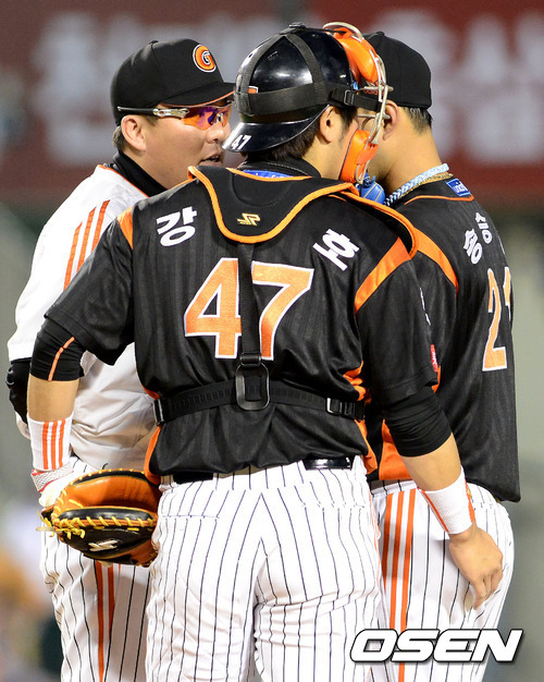25일 오후 서울 잠실구장에서 열린 '2012 팔도 프로야구' 두산 베어스와 롯데 자이언츠의 경기 6회말 1사 1,2루 롯데 주형광 투수 코치가 투수교체를 위해 마운드에 올라 선발 송승준과 이야기를 나누고 있다.