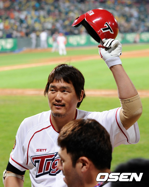 25일 오후 광주 무등야구장에서 열린 '2012 팔도 프로야구' KIA 타이거즈와 LG 트윈스의 경기, 6회말 무사 KIA 최희섭이 중월 솔로 홈런을 치고 더그아웃에서 관중석을 향해 인사를 하고 있다.