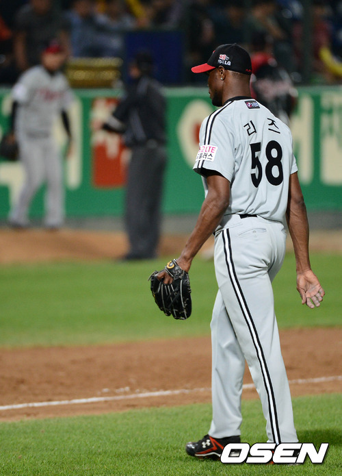 25일 오후 광주 무등야구장에서 열린 '2012 팔도 프로야구' KIA 타이거즈와 LG 트윈스의 경기, 6회말 2사 1루 KIA 이용규 타석때 LG 리즈가 마운드를 내려가고 있다. 리즈는 5⅔이닝 5실점을 기록했다.