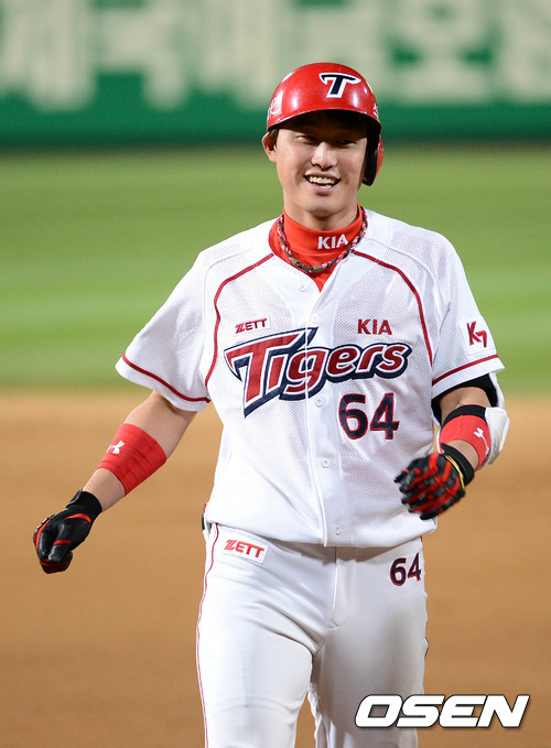 25일 오후 광주 무등야구장에서 열린 '2012 팔도 프로야구' KIA 타이거즈와 LG 트윈스의 경기, 6회말 2사 3루 KIA 이준호가 중전 1타점 적시타를 치고 환하게 웃고 있다.