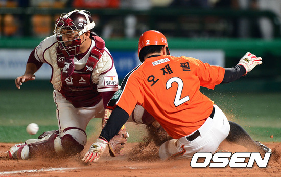 25일 오후 서울 목동구장에서 열린 '2012 팔도 프로야구' 넥센 히어로즈와 한화 이글스의 경기, 8회초 무사 1,3루에서 한화 김태균의 중견수 플라이에 3루주자 오재필이 넥센 허도환이 볼을 놓치며 세이프되고 있다.