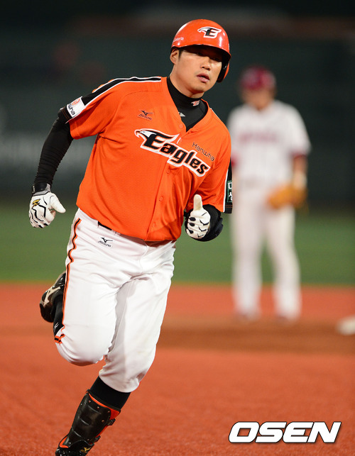 25일 오후 서울 목동구장에서 열린 '2012 팔도 프로야구' 넥센 히어로즈와 한화 이글스의 경기, 8회초 1사 1루에서 한화 최진행이 역전 투런포를 날리고 그라운드를 돌고 있다.