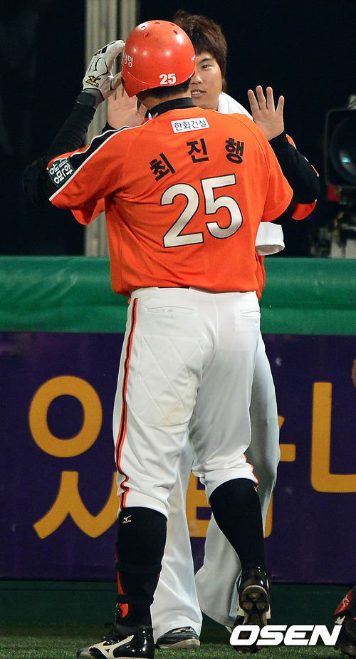 25일 오후 서울 목동구장에서 열린 '2012 팔도 프로야구' 넥센 히어로즈와 한화 이글스의 경기, 8회초 1사 1루에서 한화 최진행이 역전 투런포를 날리고 류현진과 기뻐하고 있다.
