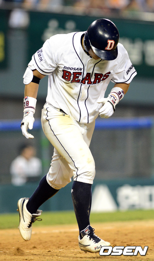 25일 오후 서울 잠실구장에서 열린 '2012 팔도 프로야구' 두산 베어스와 롯데 자이언츠의 경기 8회말 2사 만루 두산 이종욱이 좌익수 플라이 아웃으로 이닝이 종료되자 아쉬워하고 있다.