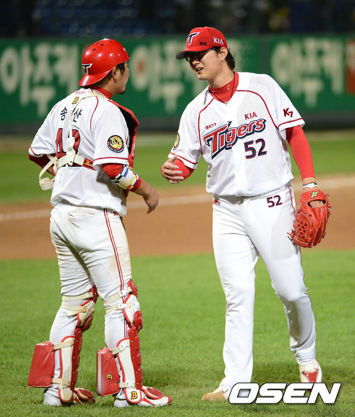 경기 종료 후 KIA 한기주와 송산이 승리의 기쁨을 나누고 있다. / sunday@osen.co.kr