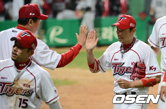 경기 종료 후 KIA 김원섭이 선동렬 감독과 승리의 기쁨을 나누고 있다. / sunday@osen.co.kr