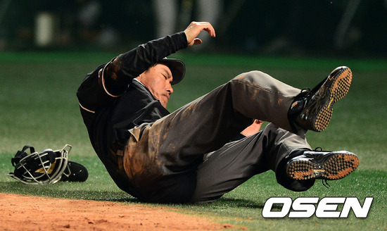 25일 오후 서울 목동구장에서 열린 '2012 팔도 프로야구' 넥센 히어로즈와 한화 이글스의 경기, 9회말 2사 2루에서 넥센 유한준이 스트라이크낫아웃에 최규순 구심이 투구에 맞아 괴로워하고 있다.