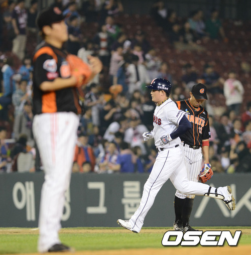 25일 오후 서울 잠실구장에서 열린 '2012 팔도 프로야구' 두산 베어스와 롯데 자이언츠의 경기 9회말 1사 1루 두산 이성렬이 투런 홈런을 치고 베이스를 돌고 있다.