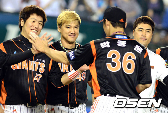 경기 종료후 롯데 선수들이 그라운드에 나와 박종윤과 하이파이브를 하고 있다. / youngrae@osen.co.kr