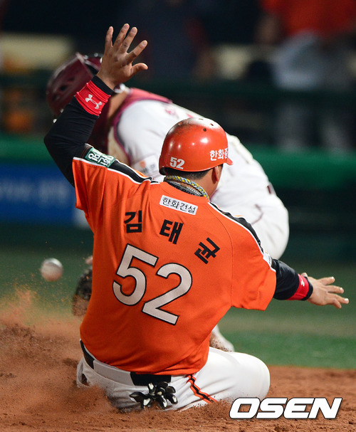 25일 오후 서울 목동구장에서 열린 '2012 팔도 프로야구' 넥센 히어로즈와 한화 이글스의 경기, 연장 10회초 2사 1,2루에서 한화 백승룡의 1타점 적시타에 김태균이 홈에서 세이프되고 있다.