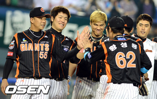 경기 종료후 롯데 김사율, 강민호, 홍성흔, 조성환이 그라운드에 나와 선수들과 하이파이브를 하고 있다. / youngrae@osen.co.kr