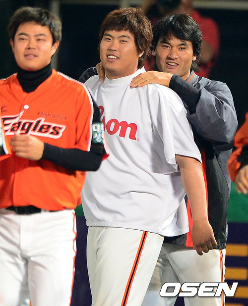 경기후 한화 박찬호가 류현진의 어깨를 주무르며 연패 탈출을 기뻐하고 있다. /jpnews@osen.co.kr
