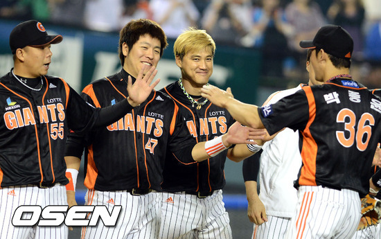 경기 종료후 롯데 김사율, 강민호, 홍성흔, 조성환이 그라운드에 나와 박종윤과 하이파이브를 하고 있다. / youngrae@osen.co.kr