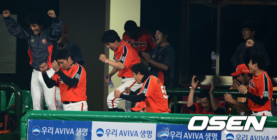 승리가 확정되자 한화 선수들이 더그아웃에서 기뻐하고 있다. /jpnews@osen.co.kr