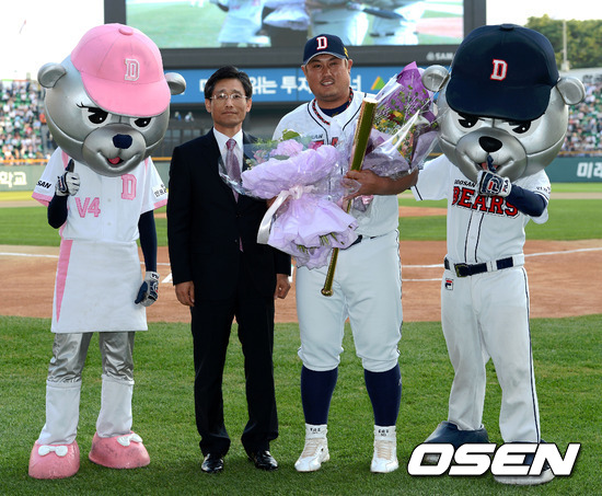 최준석이 개인통산 100홈런 시상식에서 양해영 KBO 사무총장과 기념촬영을 하고 있다. / youngrae@osen.co.kr