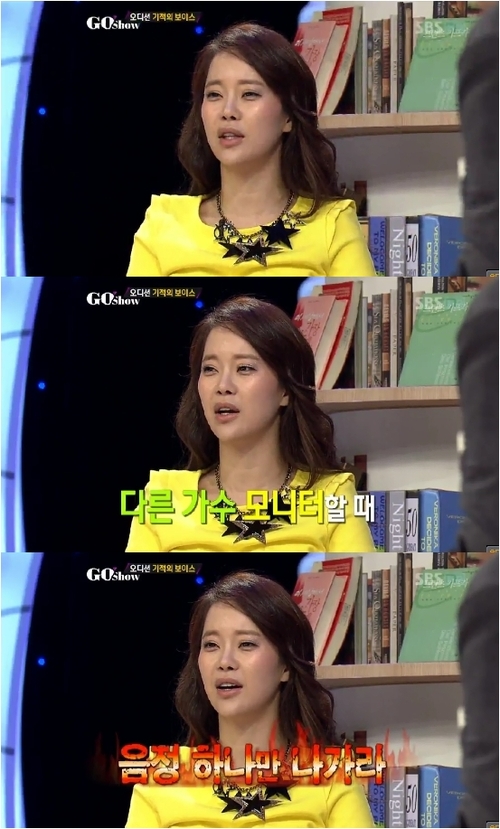 25일 방송된 SBS 토크쇼 ‘고쇼(Go show)’에서 백지영은 “정말 솔직하게 말하겠다”고 운을 뗀 후 “다른 가수들의 무대를 보면서 음정 하나만 나가길 바란다”고 말했다.