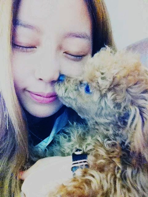사진 속 구하라는 강아지를 품에 안고 눈을 감은 채 행복한 미소를 지어 보이고 있다. 특히 강아지는 구하라에게 뽀뽀를 하는 듯한 모습으로 더욱 다정한 분위기를 연출한다.