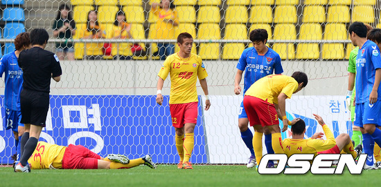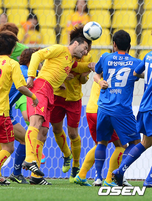 26일 오후 성남 탄천종합운동장에서 열린 '현대오일뱅크 K리그 2012' 성남 일화와 대구 FC의 경기, 전반 성남 임종은과 사샤가 공중볼 과정에서 머리를 부딪치고 괴로워하고 있다.