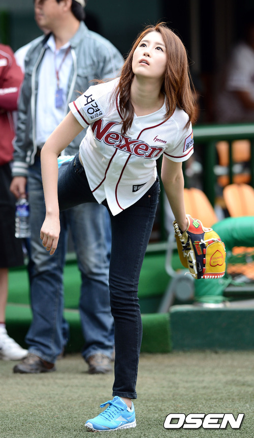 26일 서울 목동구장에서 열린 '2012 팔도 프로야구' 넥센 히어로즈와 한화 이글스의 경기에 U1 미디어 이은비 아나운서가 시구 연습을 하고 있다.