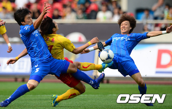 26일 오후 성남 탄천종합운동장에서 열린 '현대오일뱅크 K리그 2012' 성남 일화와 대구 FC의 경기, 전반 성남 한상운이 대구 유경렬 이지남의 수비를 피해 슛을 시도하고 있다.