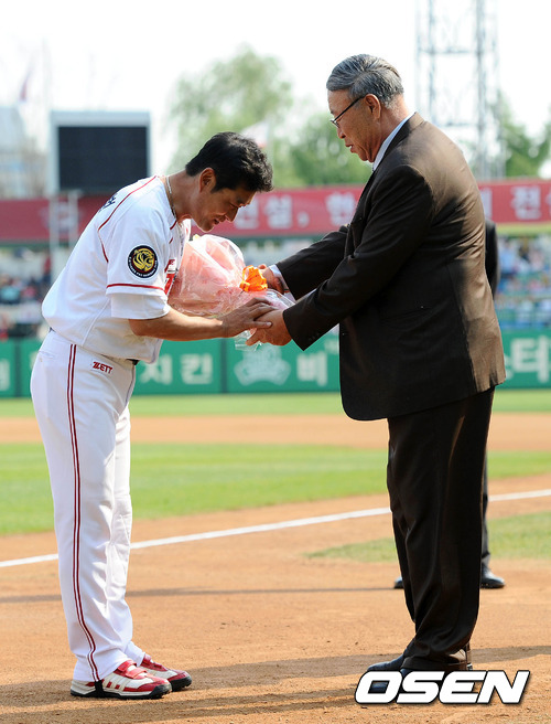 26일 오후 광주 무등야구장에서 열린 '2012 팔도 프로야구' KIA 타이거즈와 LG 트윈스의 경기에 앞서 이종범이 경기 종료후 은퇴식에 앞선 식전행사에서 김응룡 전해태 타이거즈 감독이 꽃다발을 전달하고 있ㄷ.