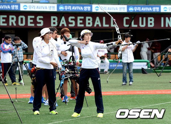 26일 서울 목동구장에서 열린 '2012 팔도 프로야구' 넥센 히어로즈와 한화 이글스의 경기전 2012 런던 올림픽 양궁 대표팀이 소음 적응 훈련을 갖고 있다.