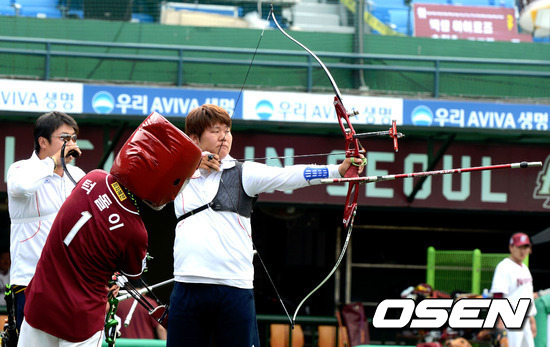 26일 서울 목동구장에서 열린 '2012 팔도 프로야구' 넥센 히어로즈와 한화 이글스의 경기전 2012 런던 올림픽 양궁 대표팀이 소음 적응 훈련을 갖고 있다.