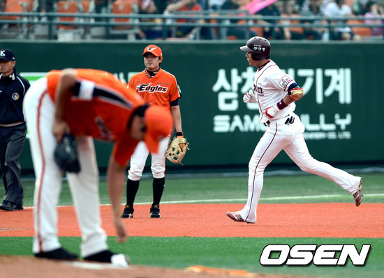26일 서울 목동구장에서 열린 '2012 팔도 프로야구' 넥센 히어로즈와 한화 이글스의 경기 2회말 1사 넥센 강정호가 솔로 홈런을 치고 베이스를 돌고 있다.