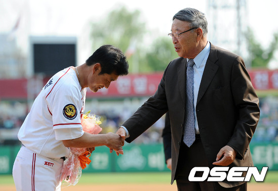 김 전 사장은 식전행사에 참석해 그라운드에 올라가 이종범에게 꽃다발을 전달하면서 제자의 은퇴에 대한 아쉬움을 대신했다. 김 전 사장이 그라운드에 나타나자 팬들은 대환호성으로 답했다. 타이거즈 V9 명장에 대한 예우였다. 머리숙여 인사한 이종범은 김 전사장의 허리를 손으로 휘감고 촬영 포즈를 취해 선수들의 폭소를 자아냈다.