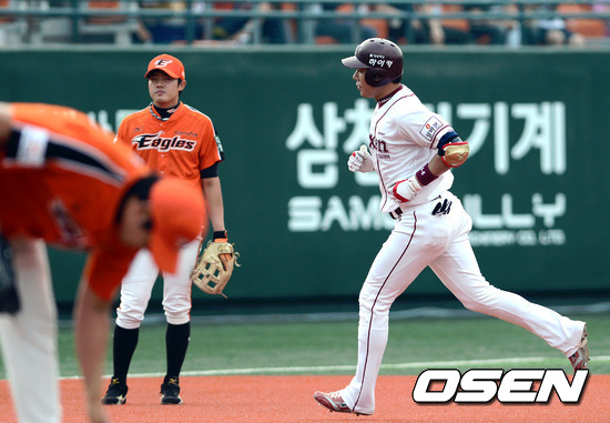 26일 서울 목동구장에서 열린 '2012 팔도 프로야구' 넥센 히어로즈와 한화 이글스의 경기 2회말 1사 넥센 강정호가 솔로 홈런을 치고 그라운드를 돌고 있다.