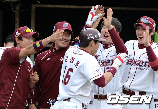26일 서울 목동구장에서 열린 '2012 팔도 프로야구' 넥센 히어로즈와 한화 이글스의 경기 2회말 1사 넥센 강정호가 솔로 홈런을 치고 덕아웃에서 선수들과 기뻐하고 있다.