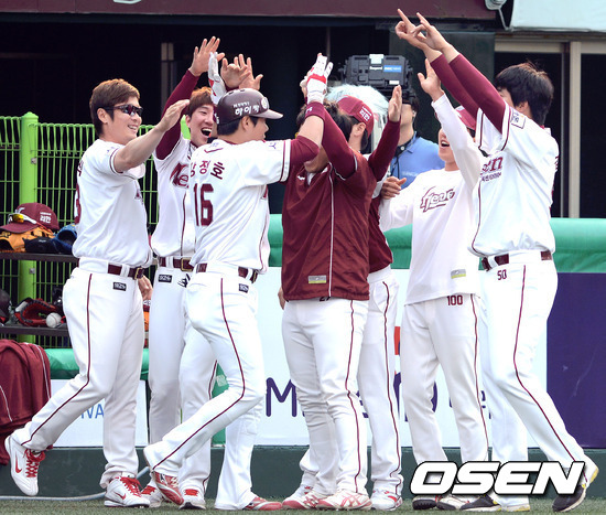 26일 서울 목동구장에서 열린 '2012 팔도 프로야구' 넥센 히어로즈와 한화 이글스의 경기 2회말 1사 넥센 강정호가 솔로 홈런을 치고 덕아웃에서 선수들과 기뻐하고 있다.