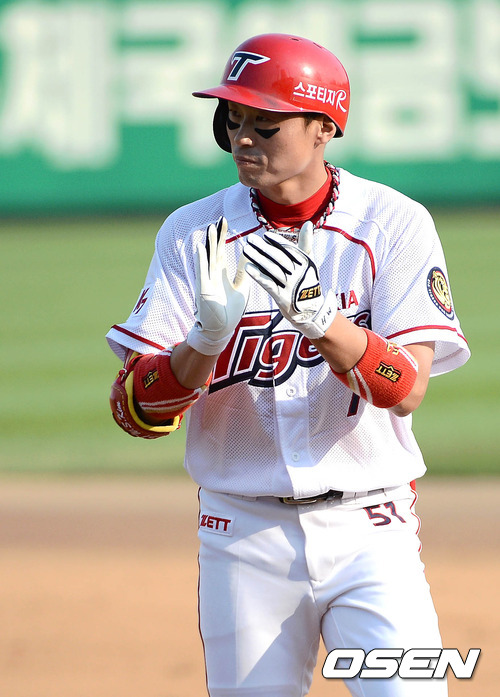 26일 오후 광주 무등야구장에서 열린 '2012 팔도 프로야구' KIA 타이거즈와 LG 트윈스의 경기, 1회말 1사 2루 KIA 김원섭이 중전 1타점 선제 적시타 치고 환호를 하고 있다.