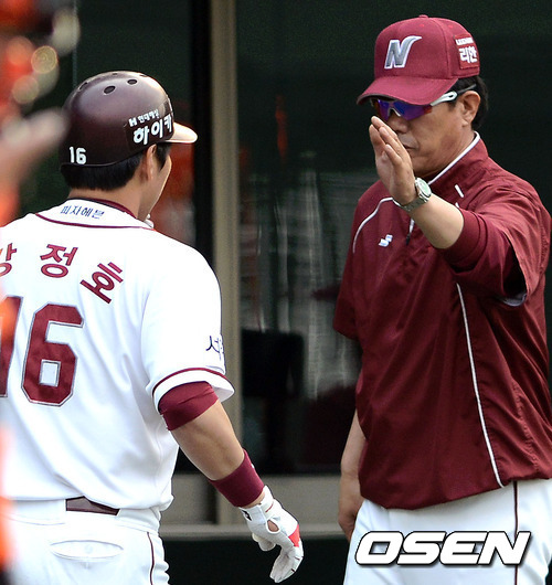 26일 서울 목동구장에서 열린 '2012 팔도 프로야구' 넥센 히어로즈와 한화 이글스의 경기 2회말 1사 넥센 강정호가 솔로 홈런을 치고 김시진 감독과 하이파이브를 하고 있다.