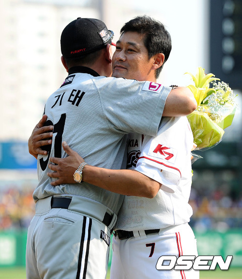 26일 오후 광주 무등야구장에서 열린 '2012 팔도 프로야구' KIA 타이거즈와 LG 트윈스의 경기에 앞서 이종범이 LG 김기태 감독과 인사를 나누고 있다.
