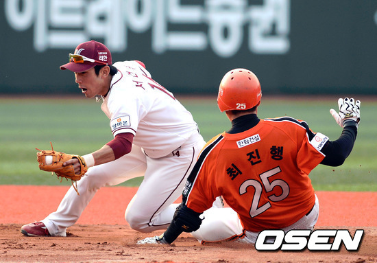 26일 서울 목동구장에서 열린 '2012 팔도 프로야구' 넥센 히어로즈와 한화 이글스의 경기 3회초 무사 한화 최진행이 좌전 안타를 치고 2루베이스를 슬라이딩으로 들어가고 있다.