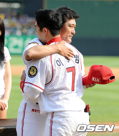 26일 오후 광주 무등야구장에서 열린 '2012 팔도 프로야구' KIA 타이거즈와 LG 트윈스의 경기에 앞서 이종범이 KIA 이용규와 포옹을 하고 있다.