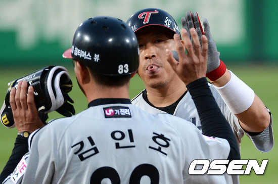 26일 오후 광주 무등야구장에서 열린 '2012 팔도 프로야구' KIA 타이거즈와 LG 트윈스의 경기, 7회초 1사 만루 LG 이병규가 좌전 2타점 역전 적시타를 치고 김인호 코치와 하이파이브를 하고 있다.