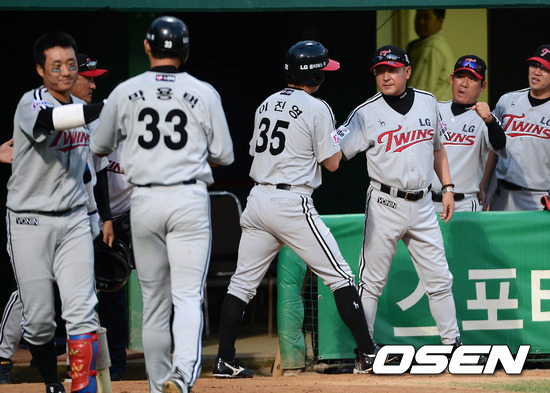 26일 오후 광주 무등야구장에서 열린 '2012 팔도 프로야구' KIA 타이거즈와 LG 트윈스의 경기, 7회초 1사 만루 LG 이병규의 좌전 2타점 역전 적시타 때 홈을 밟은 2루주자 박용택과 3루주자 이진영이 더그아웃에서 김기태 감독의 축하를 받고 있다.
