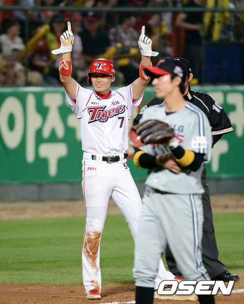 26일 오후 광주 무등야구장에서 열린 '2012 팔도 프로야구' KIA 타이거즈와 LG 트윈스의 경기, 7회말 2사 1,2루 KIA 김원섭이 중전 2타점 역전 적시타를 치고 환호하고 있다.