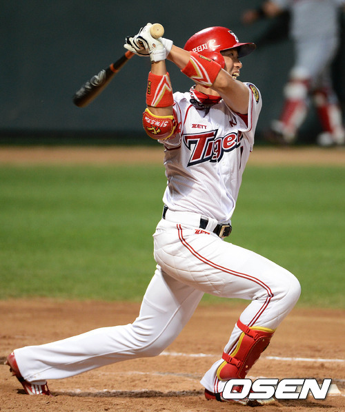 26일 오후 광주 무등야구장에서 열린 '2012 팔도 프로야구' KIA 타이거즈와 LG 트윈스의 경기, 7회말 2사 1,2루 KIA 김원섭이 중전 2타점 역전 적시타를 치고 있다.