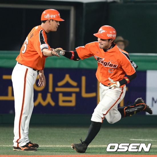 26일 서울 목동구장에서 열린 '2012 팔도 프로야구' 넥센 히어로즈와 한화 이글스의 경기 8회초 1사 한화 한상훈이 솔로 홈런을 치고 김민재 코치와 하이파이브를 하고 있다.