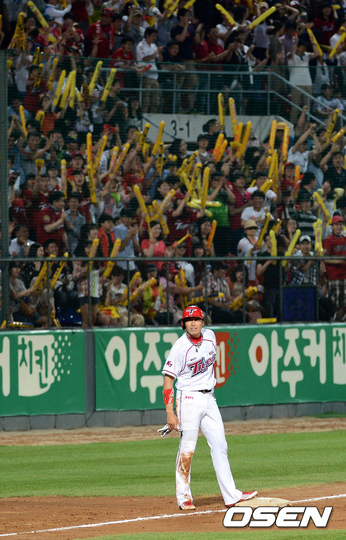 26일 오후 광주 무등야구장에서 열린 '2012 팔도 프로야구' KIA 타이거즈와 LG 트윈스의 경기, 7회말 2사 1,2루 KIA 김원섭이 중전 2타점 역전 적시타를 치고 타임을 외치고 있다.