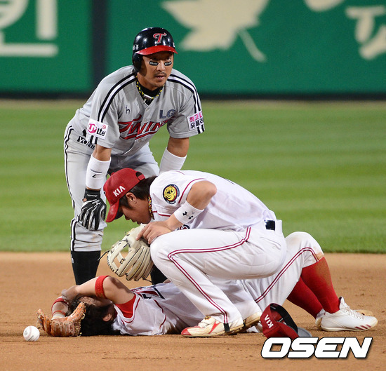 26일 오후 광주 무등야구장에서 열린 '2012 팔도 프로야구' KIA 타이거즈와 LG 트윈스의 경기, 8회초 1사 1,3루 LG 이진영의 1타점 동점 적시타때 1루주자 이병규와 충돌한 KIA 김선빈이 그라운드에 누워 고통스러워하고 있다.