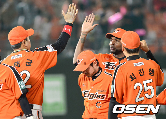 경기 종료후 한화 김태균, 바티스타, 한상훈, 최진행이 기뻐하고 있다. / youngrae@osen.co.kr