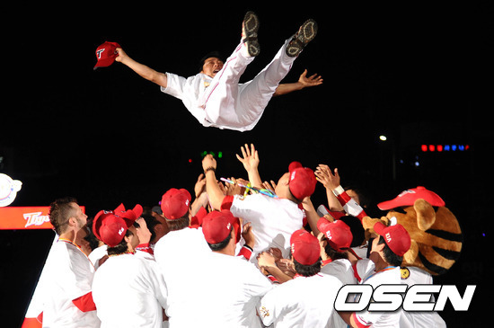 26일 오후 광주 무등야구장에서 열린 이종범 선수의 은퇴식에서 KIA 선수들이 은퇴식을 마친 이종범을 헹가래로 배웅하고 있다.