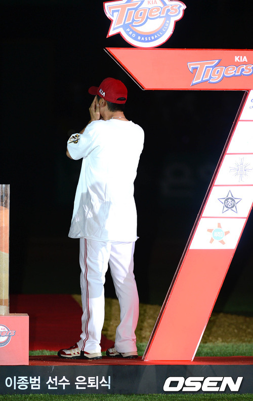26일 오후 광주 무등야구장에서 열린 이종범 선수의 은퇴식에서 KIA 이종범이 유니폼을 반납한 후 눈물을 훔치고 있다.