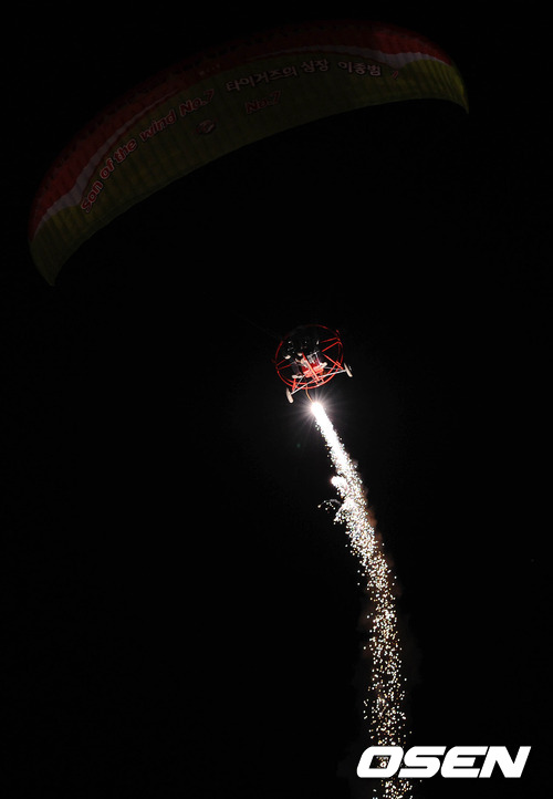 26일 오후 광주 무등야구장에서 열린 이종범 선수의 은퇴식에서 KIA 이종범이 패러글라이딩으로 경기장에 도착하고 있다.